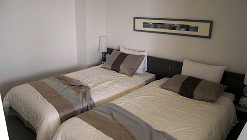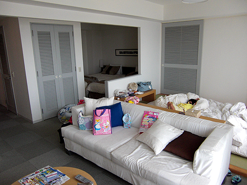 ファミリータイプのこの部屋にはベッドも用意されてるんだけどここで寝ると子供が落ちること確実なので結局一度も使いませんでした、別に用意されてる布団で寝ましたとさ。