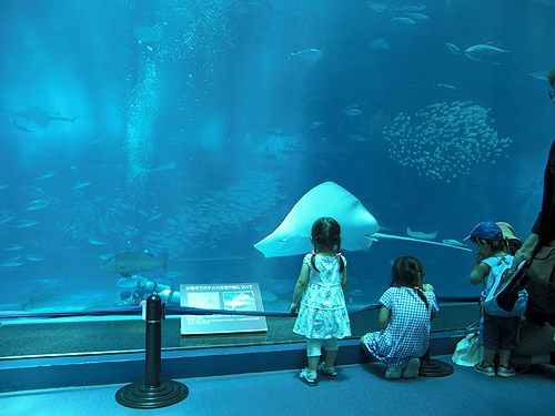 この水族館名物の大水槽、巨大なジンベエザメが泳いでやがります。