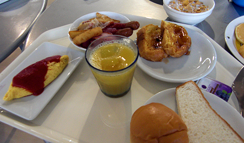 朝食はどこにでもあるバイキング形式、ソーキそばもあるよ。