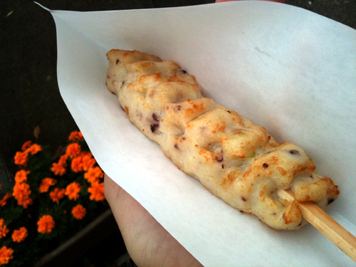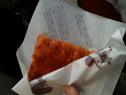 近くで売ってたできたてせんべい、一味たっぷり、激辛大スキー。…でもこれはヤバイくらい辛かった。