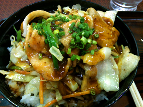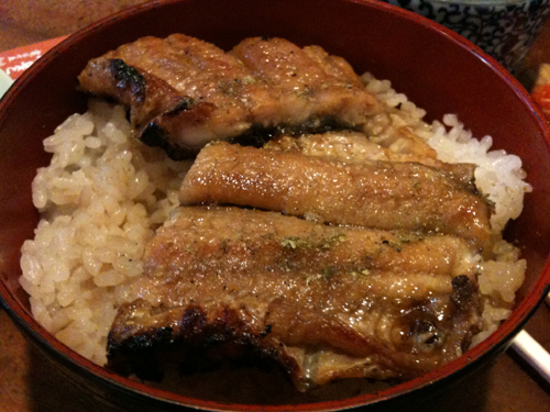 味噌ブタ丼にしてみました、美味しかったけど味噌が多すぎて御飯がべちょべちょ。他みなさんはウナギの串焼きとかキモとか食べてた、肝を一口もらったけど苦い!大人の味ですな。