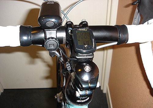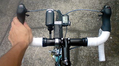 ステムに付けたサイクルコンピューターですが、元々前傾姿勢のロードバイクでこの位置の表示はかなり下を見ないと視界に入らなく、早い話がとっても見辛い。