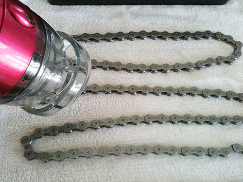 他のブロガー様の記事を参照させていただき、チェーンに付いてたサビ防止用のオイルを落としてからチェーンをドライヤーで温めて1リンク毎に丁寧にオイルしてみます。
