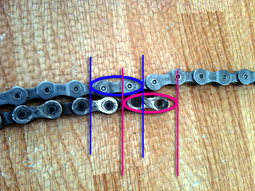端を揃えて並べてみると使用する長さの切断部分でこのくらい伸びていたようです、これが許容範囲なのかとっくに交換時期なのかはよくわからない、ただ現実問題としてチェーンがギアの歯の上を滑る事が多くてギアにも悪そうな最近でした。