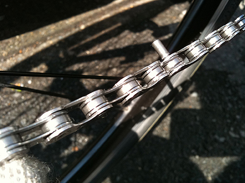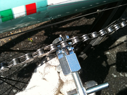 チェーンのピンを抜いたり差したりする作業は意外と力を使うのですね、思ったより固かった。