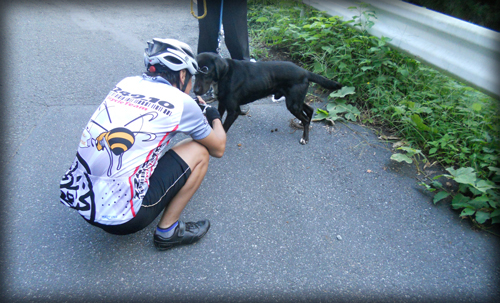 修理中に散歩のワンコと戯れるの図