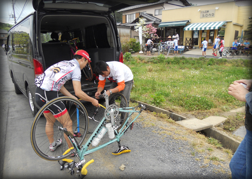いやでもフツー自転車でサイクリングの途中に来てホイール買えないじゃないですか、そこはサポートカー付きの物欲党ですよ、工具もバッチリ!買ったら即交換ですwww