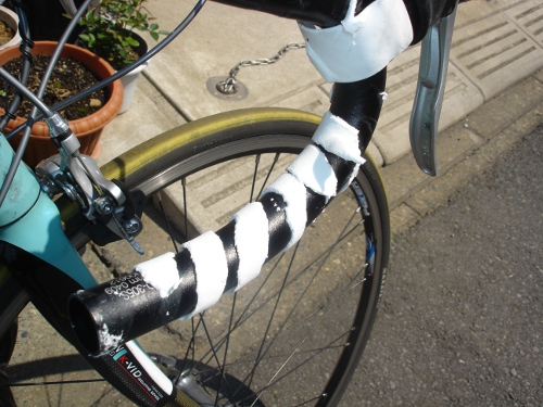 最近ポジションを変えてちょびっと前のめりになり手に体重が少しかかるようになって手が痺れる事もありバーテープを厚くて柔らかい物に変えてみる事にしました。