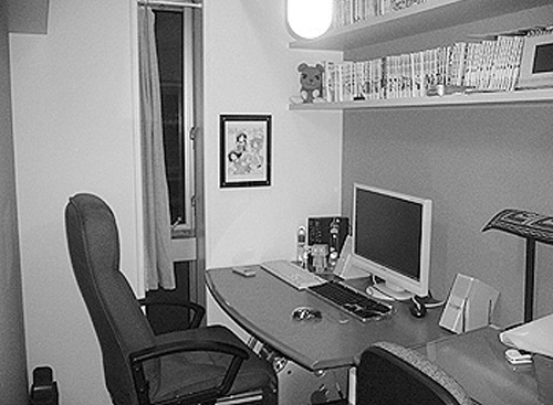 たった三畳の細長の部屋に並ぶ机二つ、一つはライトテーブルを乗せた作画用の机、もう一つはパソコンでの仕上げ用スペース。天井には特注のつり下げ式本棚がありそこにはズラっとお気に入りの漫画が並ぶ。