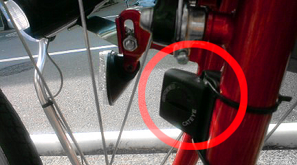フロントフォークに取り付けたセンサーと前輪のスポークに付けた磁石でタイヤの回転数を計り事前に入力したタイヤサイズを元に計算してハンドルに取り付けた表示機にスピードが表示される仕組み。